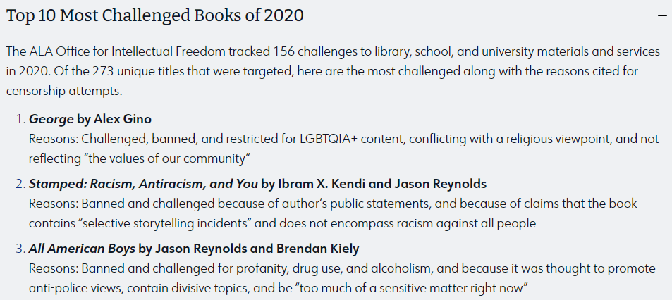 Although Long Way Down has not faced any book challenges, two other works by Jason Reynolds – All American Boys (with Brendan Kiely) and Stamped: Racism, Antiracism, and You (with Ibram X. Kendi) — were among the Top 10 Most Challenged Books of 2020. See the image below for details: