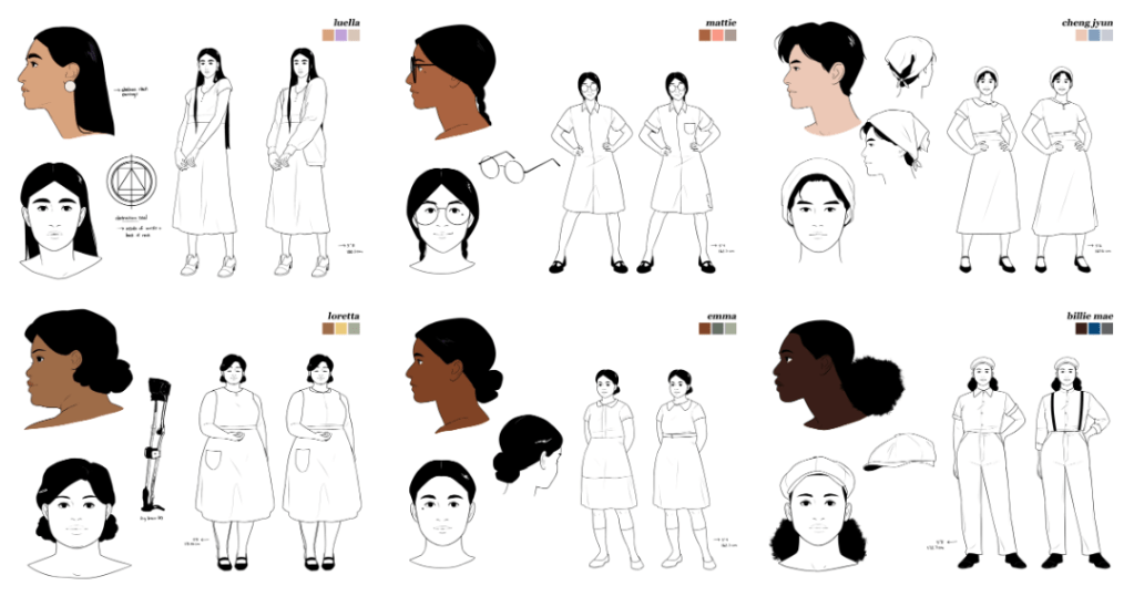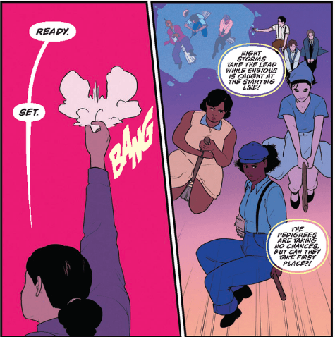 The beginning of the book is a little jarring, as it jumps right into the use of magic and fear of the police patrols without first establishing the world of the story. But gaps are quickly filled in through conversations between the characters, flashbacks, and context clues in the art. Soon the broom racing scene is introduced and we meet the diverse cast of characters who will make up the bulk of the story: Luella (Mexican and Choctaw), Mattie and Emma (Black and Choctaw), Billie Mae and Loretta (Black), and Cheng Kwan (Chinese American).